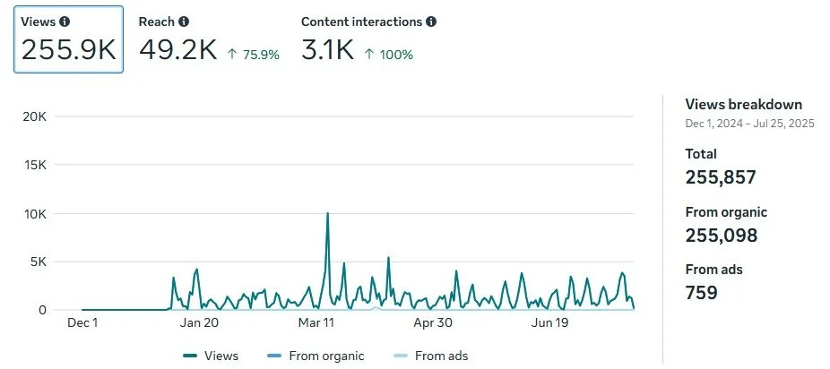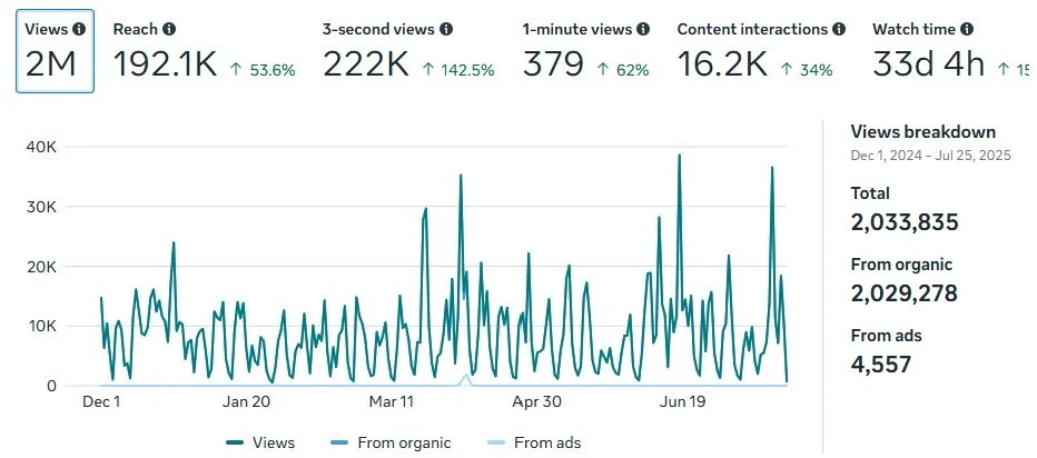 This increased engagement with customers, both potential and existing, has resulted in phenomenal results across both Facebook and Instagram - with the graphs below clearly showing the true increase in engagement and interactions (From Dec 24 - Aug 25, compared to the previous 9 months) from both followers and non-followers.